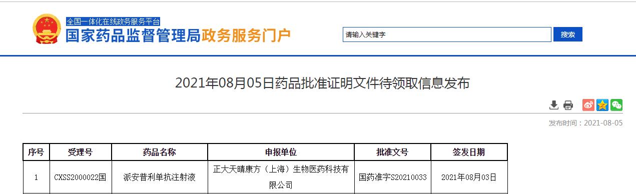 2021年8月5日,由康方生物與正大天晴共同申報的抗PD-1抗體藥物派安普利單抗(AK105)已經獲得中國國家藥品監督管理局(NMPA)批準上市。目前,藥品批準證明文件為“待領取”狀態。